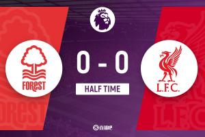 半场结束,利物浦暂0-0诺丁汉森林。