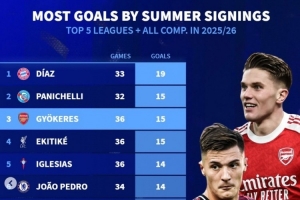 五大联赛新援进球榜:迪亚斯19球 约克雷斯、埃基蒂克、佩德罗在列