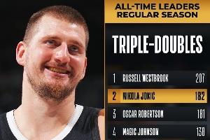 这是约基奇NBA生涯常规赛第182次三双,超越“大O”奥斯卡·罗伯特森,独占历史第二,榜首是威少(207次三双)。