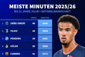 五大联赛U21球员出场时间榜:埃梅里居首,伊尔迪兹第2亚马尔第7