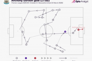数据统计显示,戈登的这粒进球,纽卡斯尔11名球员中有10人参与其中,沃尔特马德是在此期间唯一没有触球的球员。