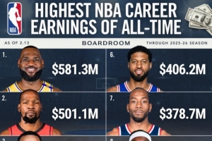 NBA 历史生涯总薪资排行榜(数据截至2026年2月13日,涵盖2025-26赛季)