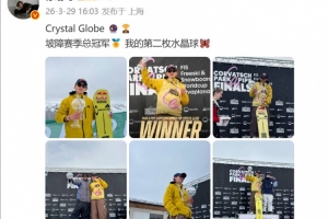 苏翊鸣写道:“Crystal Globe 🔮🏆坡障赛季总冠军🥇 我的第二枚水晶球🦋 ”